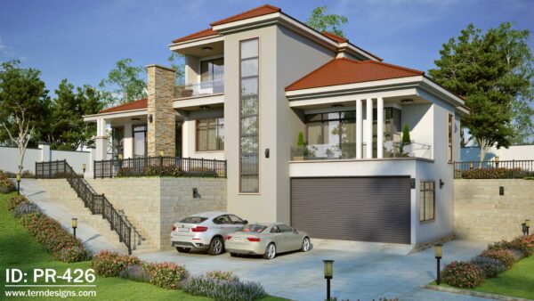 A spacious 3-storey 4-bedroom house design that maximizes the terrain usage with a basement garage.