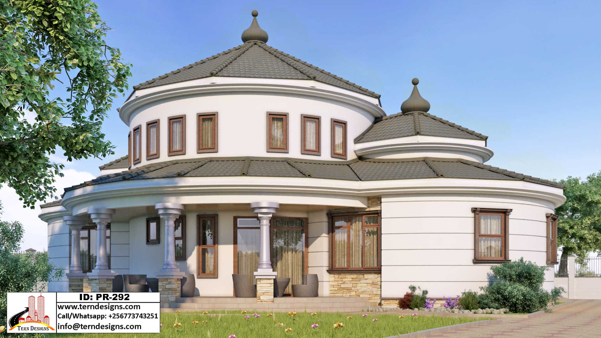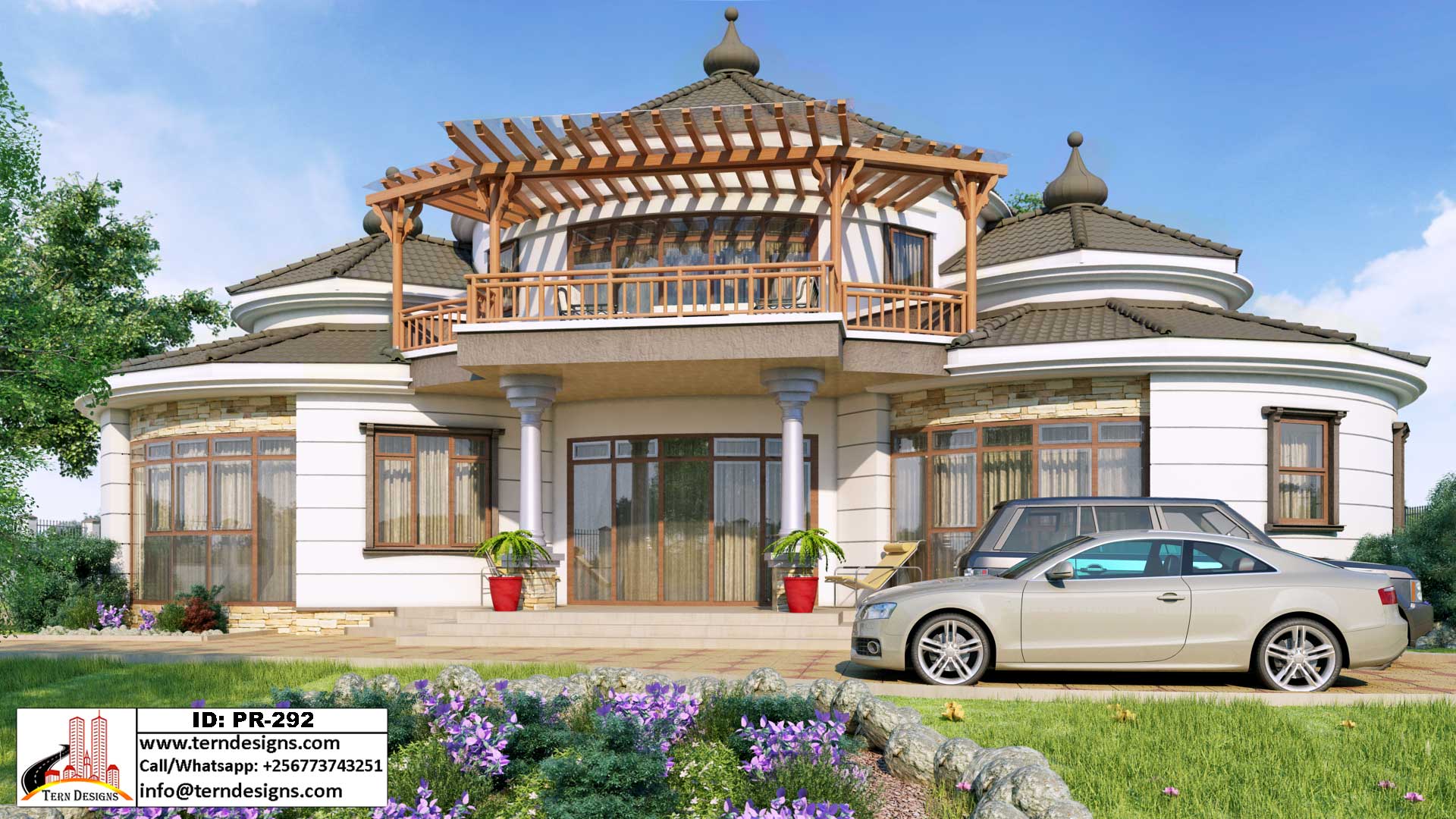 A spacious and curved 5-bedroom house design with only the master suite on upper floor. It has a master bedroom open to a big balcony finished with a wooden pergola. The entire design is done to maximize your love for curved spaces.